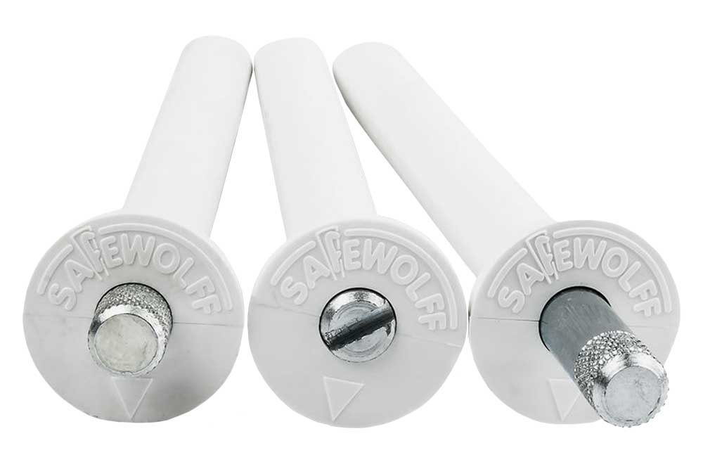 Zum Sichern wird der montierte Bolzen unter leichtem Druck nach rechts gedreht, fährt dann selbstständig aus der Wand und verriegelt. Zum Entsichern wird der Bolzen erneut nach leicht nach rechts gedreht, in die Wand geschoben und mit einem leichten Drehen nach links wieder eingerastet und arretiert. Je nach gewünschtem Einsatz, ist es sinnvoll mehrere Safewolff-Sicherungen einzusetzen und asymetrisch anzuordnen (siehe Anwendungsbeispiele). Alternativ können Sie den Safewolff auch nur auf der Griffseite einsetzen und auf der Schrnierseite setzen Sie eine oder mehrere Bandseitensicherungen ein.